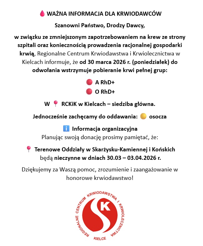 (Uwaga: Oddział w Skarżysku-Kam. nieczynny we wtorki, w które odbywa się akcja wyjazdowa w Starachowicach)