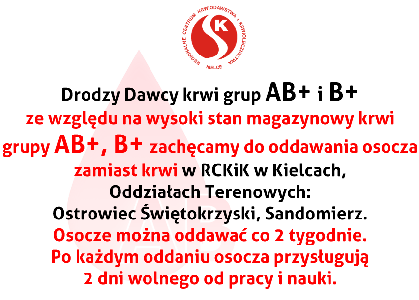 UWAGA!! Na zabiegi trombaferezy (oddanie płytek krwi) i plazmaferezy (oddanie osocza) rejestracja do godziny 13:00 tylko od poniedziałku do piątku.