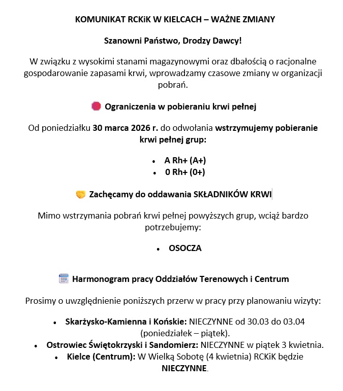 (Uwaga: Oddział w Skarżysku-Kam. nieczynny we wtorki, w które odbywa się akcja wyjazdowa w Starachowicach)